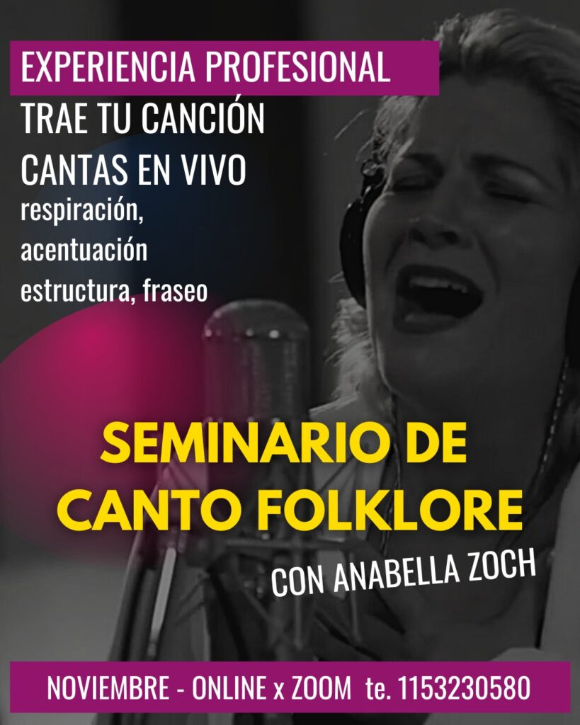 Este seminario está diseñado para cantantes, estudiantes de canto y amantes del folklore, tanto quienes ya interpretan estos géneros como quienes desean experimentarlos por primera vez con acompañamiento profesional.Soy Anabella Zoch, cantautora y formadora vocal, y en este encuentro voy a trabajar de manera personalizada con cada participante.Cada persona traerá una canción propia del repertorio folklórico argentino para trabajar.No se requieren conocimientos previos:📌 Si ya cantás folklore, vas a perfeccionar tu técnica e interpretación.📌 Si nunca cantaste folklore, vas a tener una introducción clara, guiada y práctica para descubrir estos géneros con seguridad.El trabajo grupal potencia el aprendizaje: escuchar cómo otros resuelven ritmo, acentos y expresión abre nuevas perspectivas para tu propia práctica vocal.